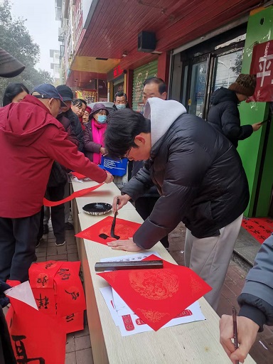 书写现场气氛热烈祥和,长桌如阵,红纸漫卷,浓郁的墨香在空气中浮动流淌。群众层层环绕,笑容如春阳般灿烂。红纸黑字,传递着浓浓的年味,更在笔墨流转间连缀起文化的记忆与情感的纽带。